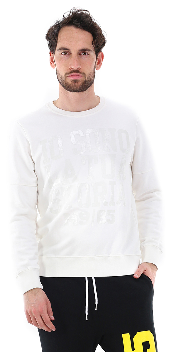 Felpa in cotone a maniche lunghe e collo a giro. Bordi a polsini e stampa logata frontale. Il modello è alto 1.80 ed indossa la taglia M.