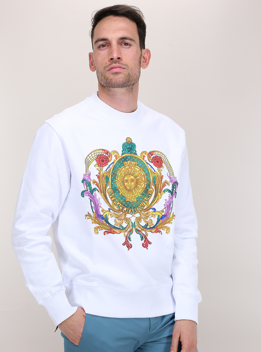 Maglia Versace Jeans Couture in felpa di cotone a maniche lunghe e collo a giro. Stampa logata frontale multicolor. Il modello è alto 1.80 ed indossa la taglia M.