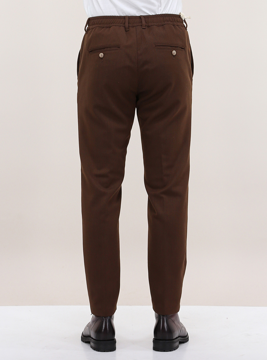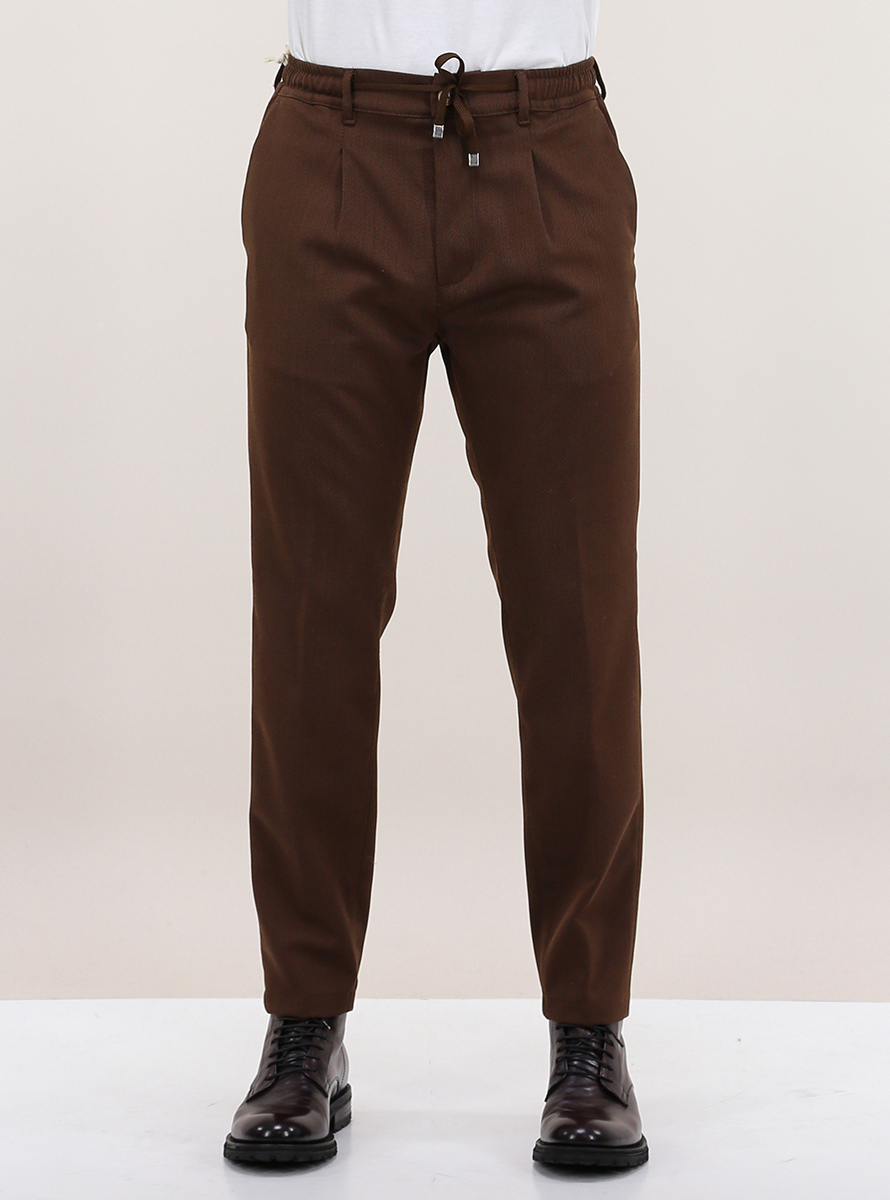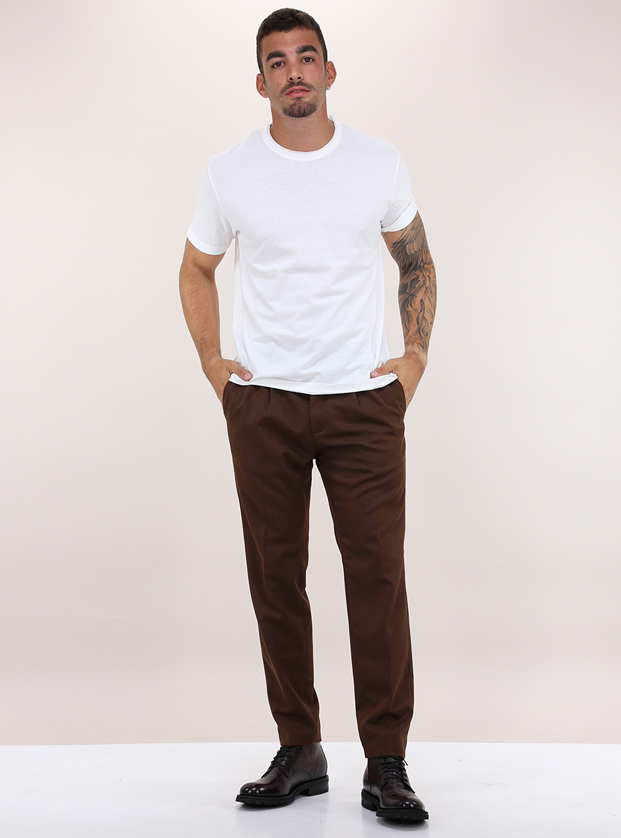 Pantalone Cruna in misto lana stretch mille righe. Tasche all'americana e a filetto sul retro. Coulisse in vita e pince frontali. Il modello è alto 1,80 e indossa la taglia 48.