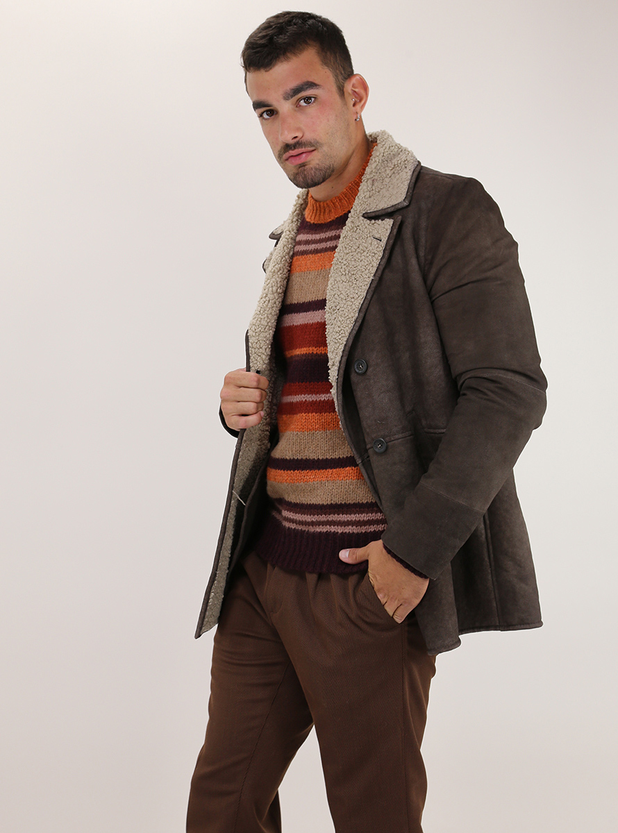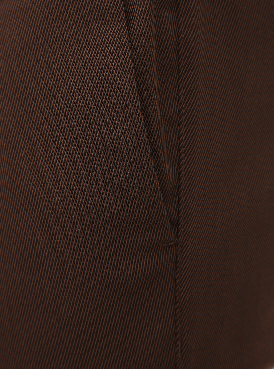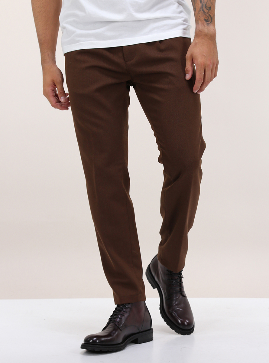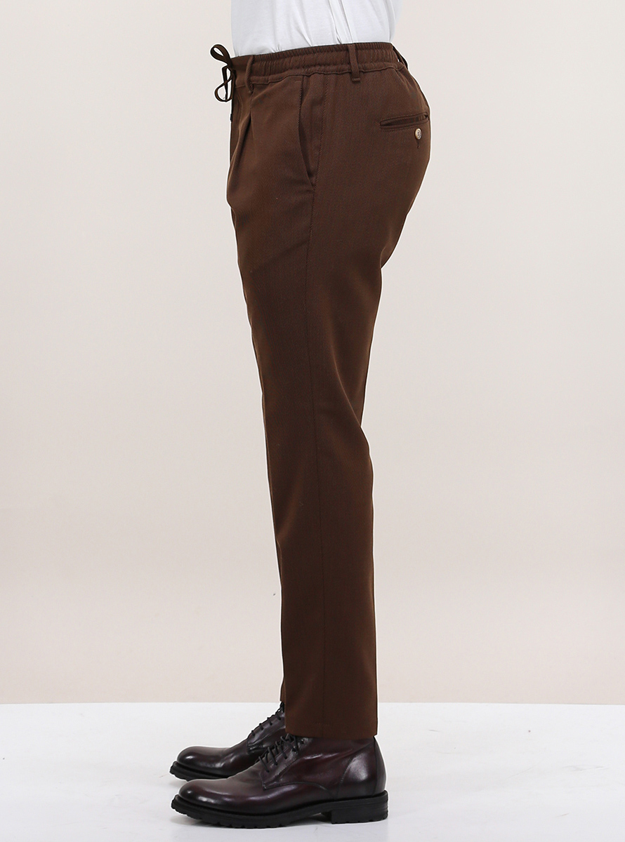 Pantalone Cruna in misto lana stretch mille righe. Tasche all'americana e a filetto sul retro. Coulisse in vita e pince frontali. Il modello è alto 1,80 e indossa la taglia 48.