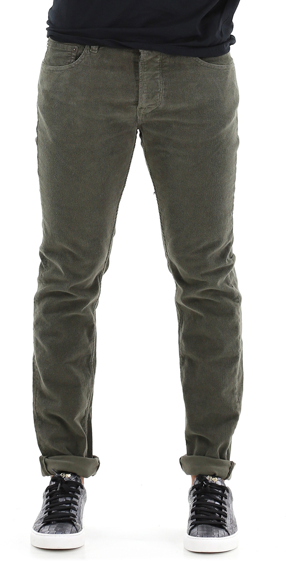 Pantalone cinque tasche a costine in cotone stretch . Il modello è alto 1,82 ed indossa la taglia 32.