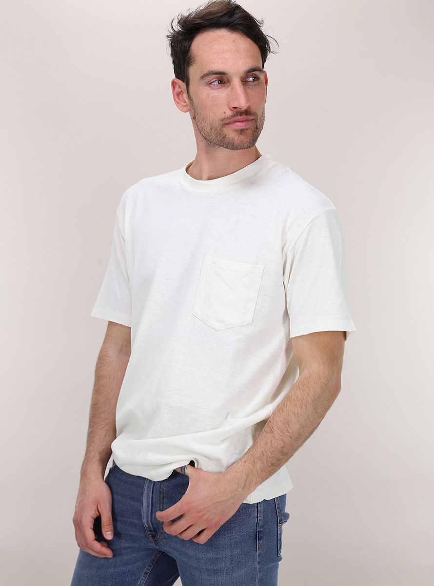 T-shirt oversize Grifoni in cotone e lino a maniche corte e collo a giro. Taschino applicato frontale e bordi con abrasioni. Il modello è alto 1.80 ed indossa la taglia M.