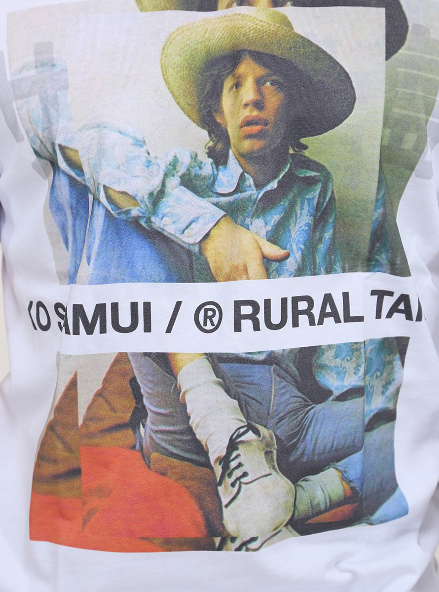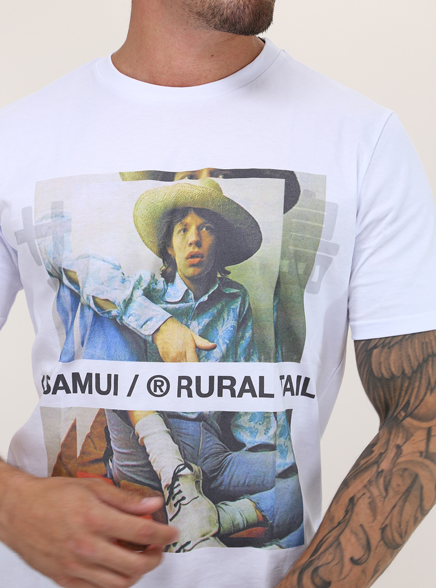T-shirt KO Samui in cotone a maniche corte e collo a giro. Stampa frontale Mick Jagger. Il modello è alto 1.75 e indossa la taglia M.