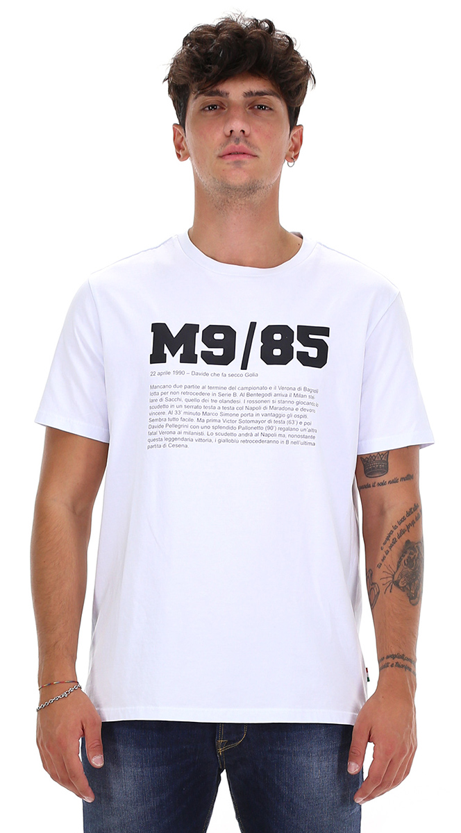 T-shirt in cotone a girocollo, manica corta con logo gommato applicato e stampa. Il modello è alto 1,82 e indossa la taglia M.