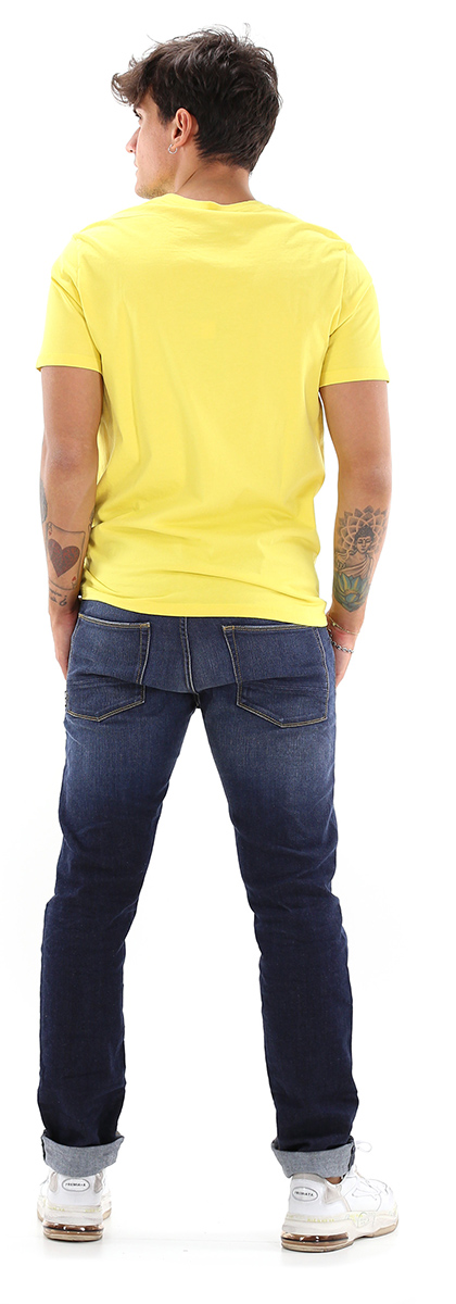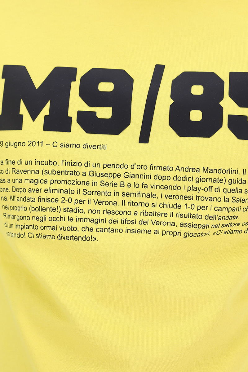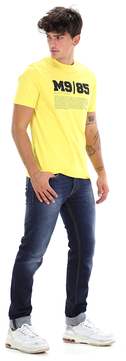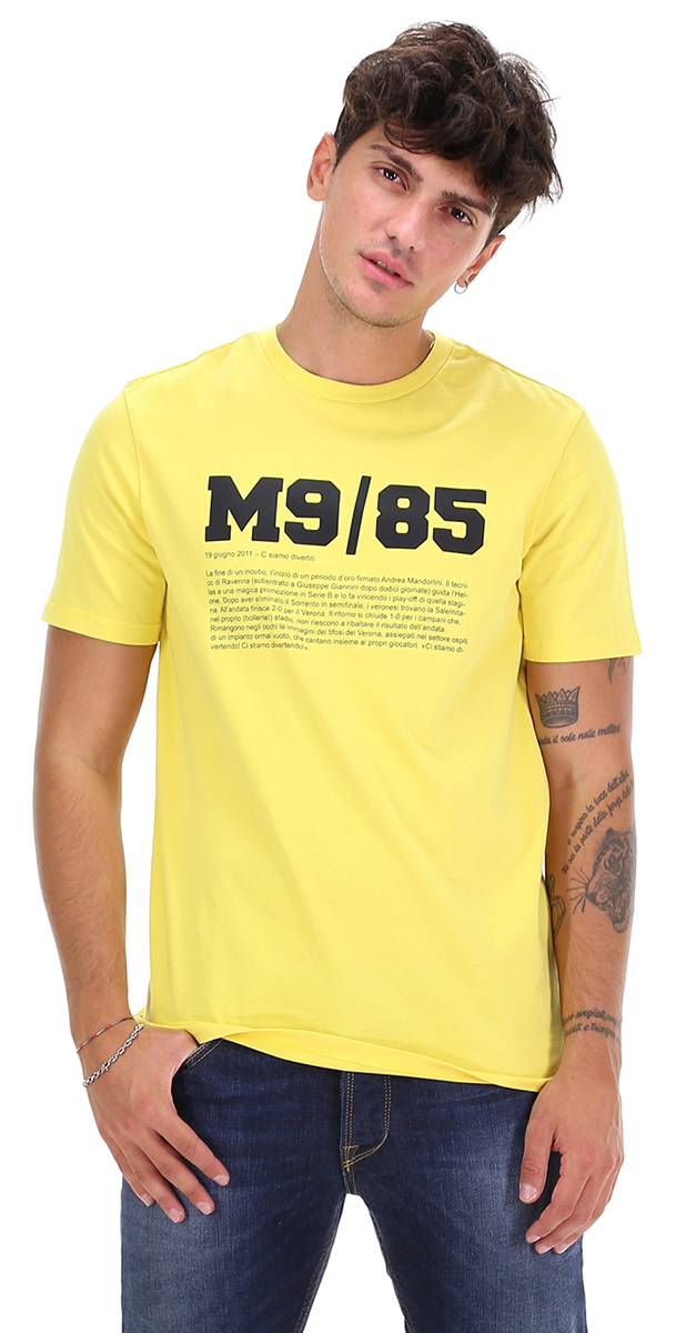 T-shirt in cotone a girocollo, manica corta con logo gommato applicato e stampa. Il modello è alto 1,82 e indossa la taglia M.