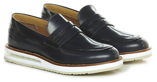 Mocassino in pelle spazzolata effetto delavè e pelle spazzolata forata con suola in gomma. Tacco 35, platform 25 con battuta 10. Camera d'aria interna alla suola.