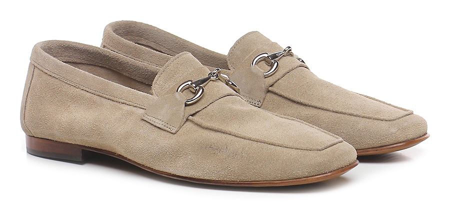 Mocassino in camoscio con morsetto frontale, suola in cuoio. Tacco 15. Inserto elasticizzato ambo lati.