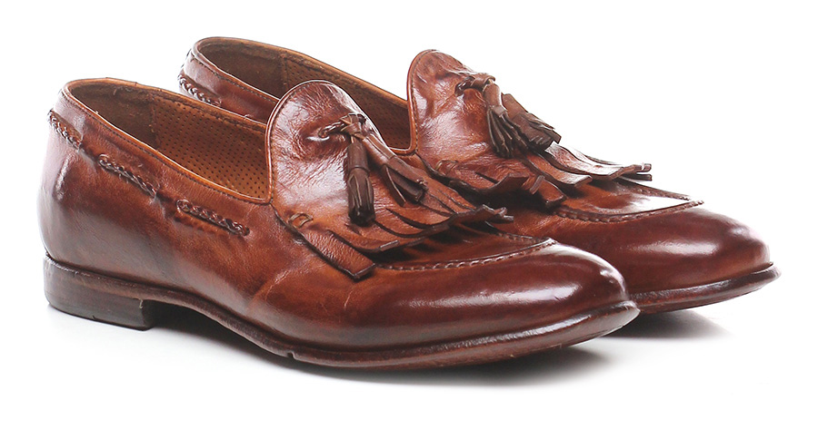 Mocassino in pelle effetto delavè vintage con patella e nappine frontale, suola in cuoio. Tacco 20.
