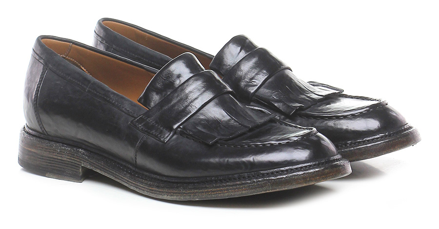 Mocassino in pelle effetto delavè vintage , patella con frange frontale, suola in cuoio e gomma. Tacco 30.