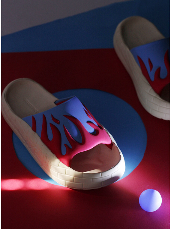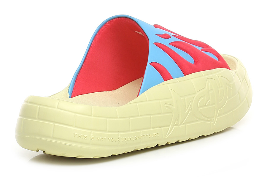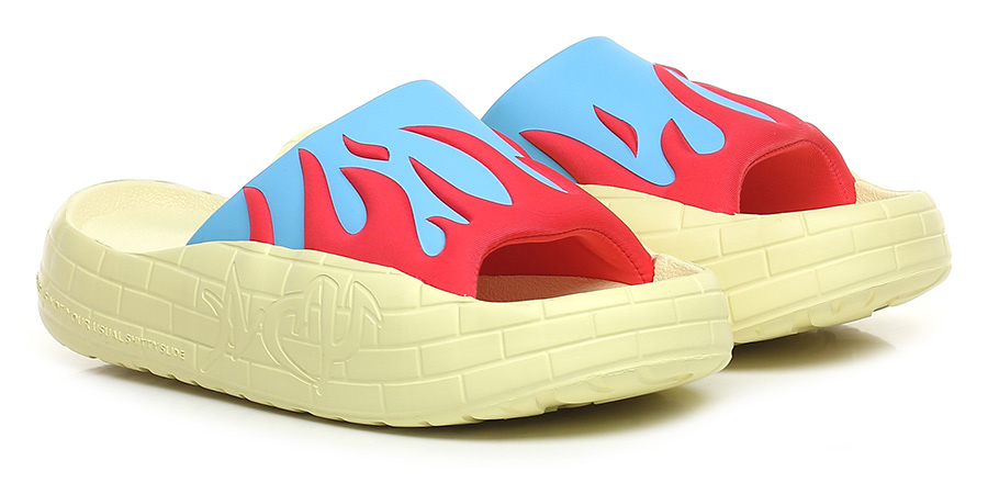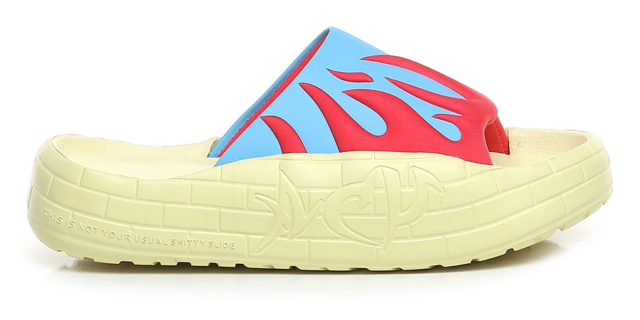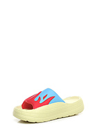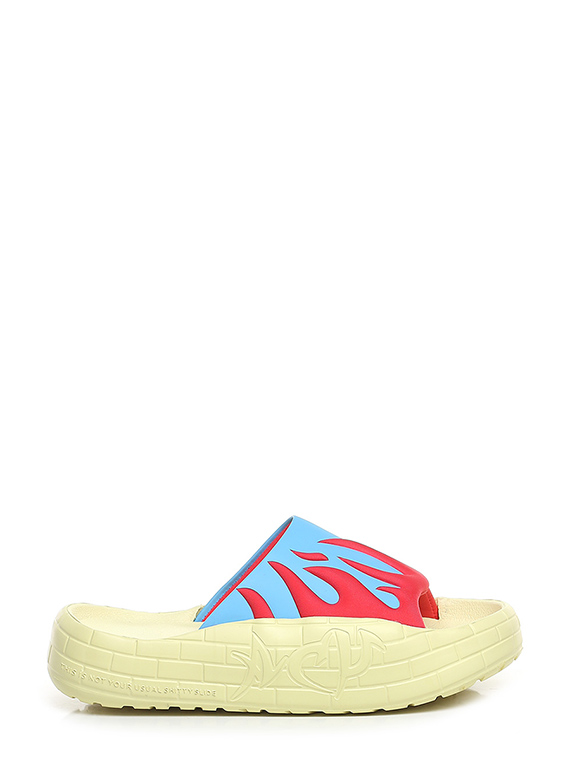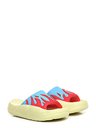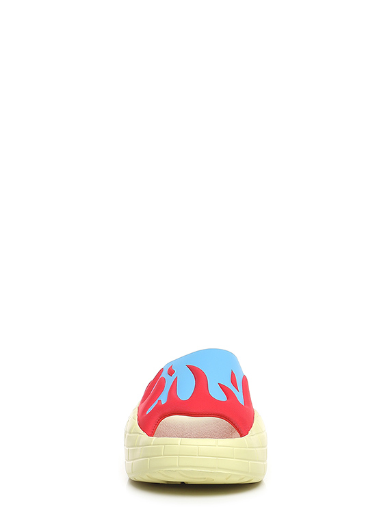 Sandalo in gomma e tessuto. Suola in gomma: altezza tacco 35mm, platform 25mm con battuta di 10mm.