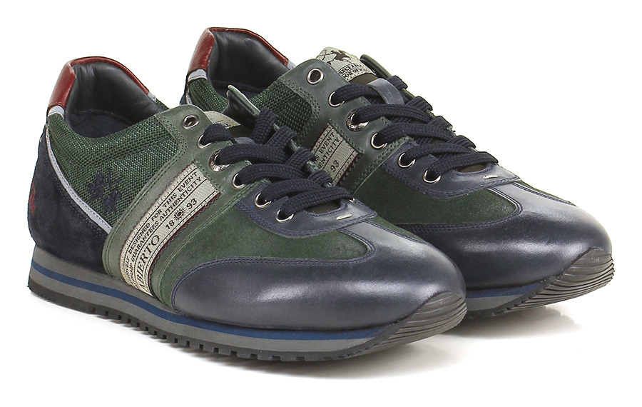 Sneaker in pelle, camoscio e tessuto con suola in gomma. Tacco 25, platform 15 con battuta 10.