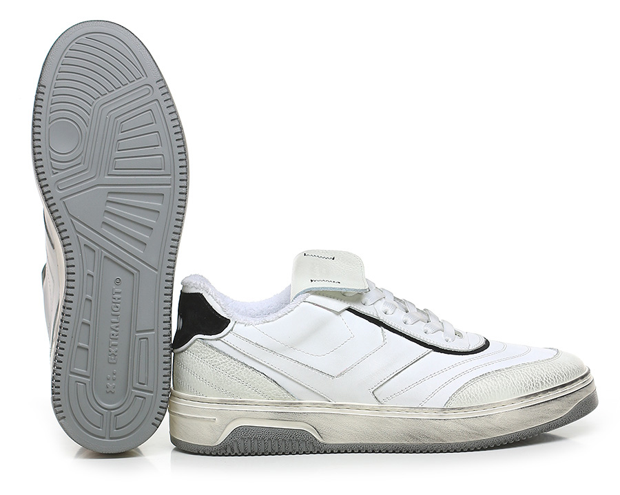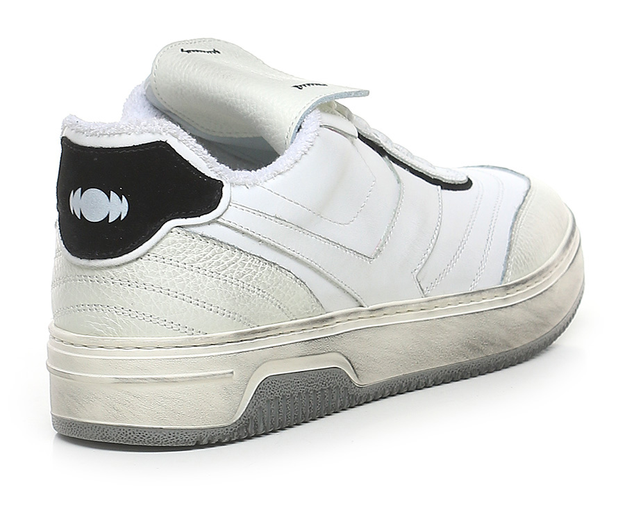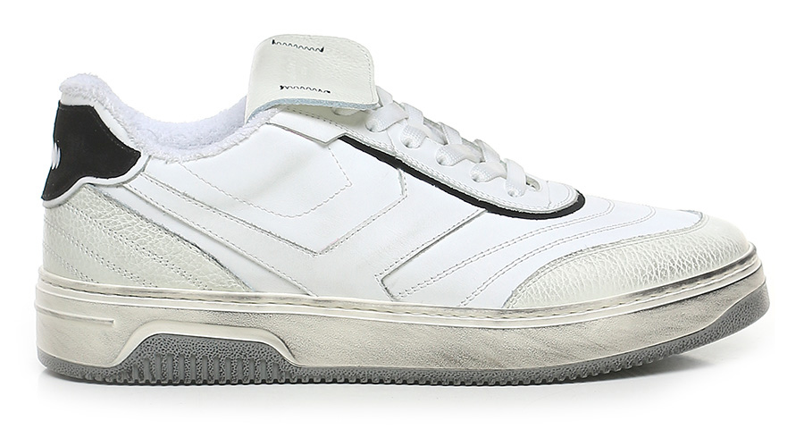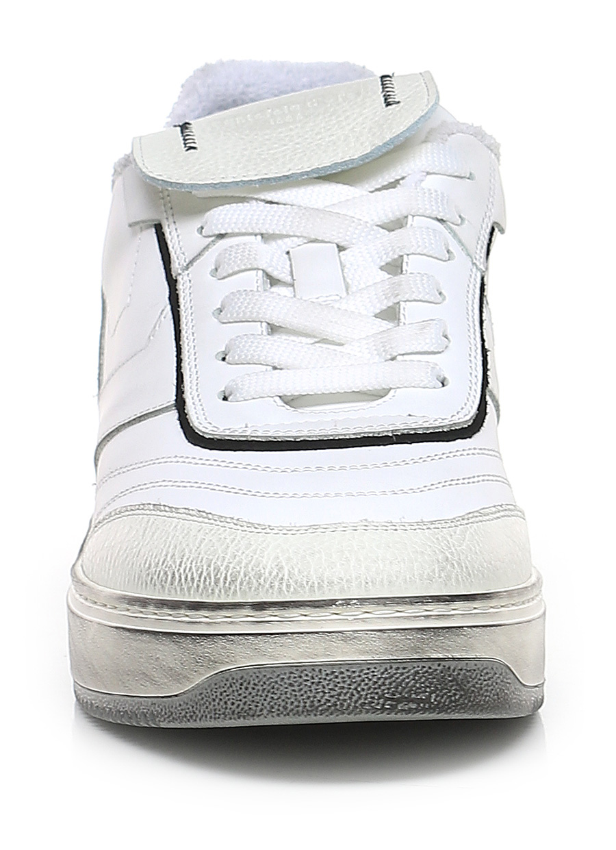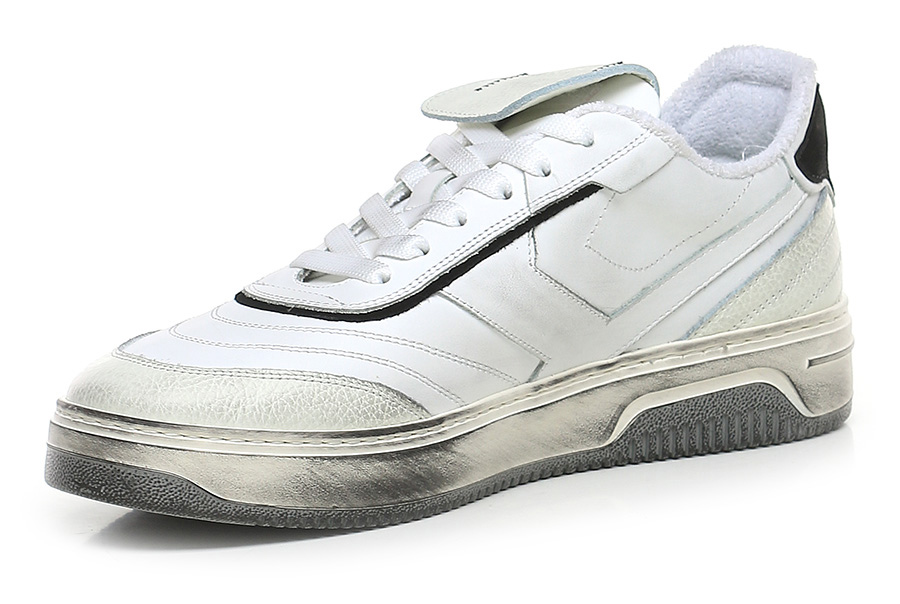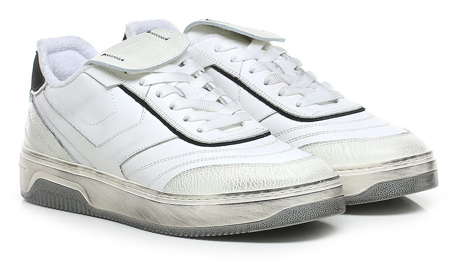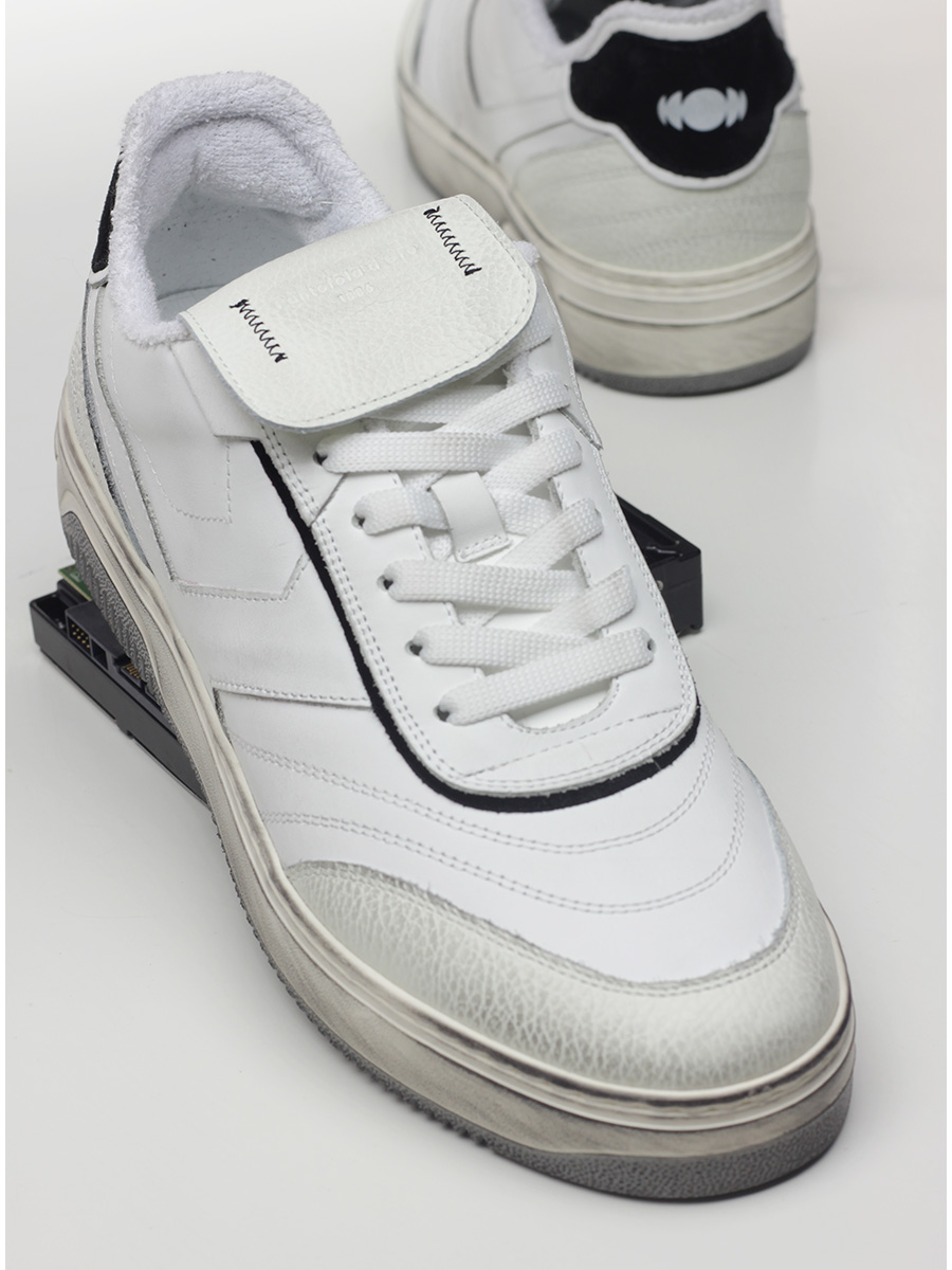 Sneaker in pelle effetto vintage con talloncino in camoscio vintage e suola in gomma effetto vintage. Altezza tacco 40mm, platform 30mm con battuta 10mm.