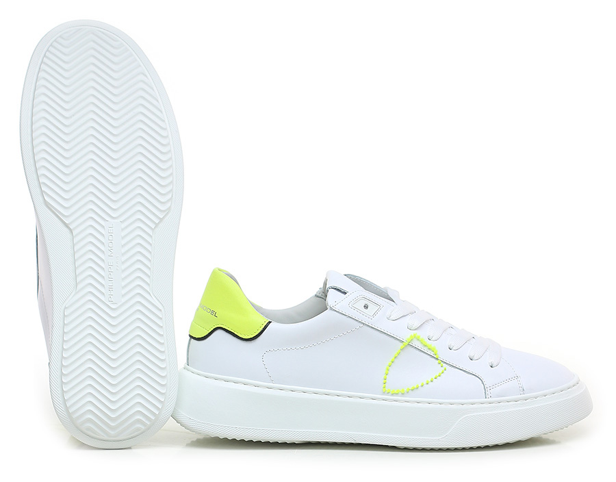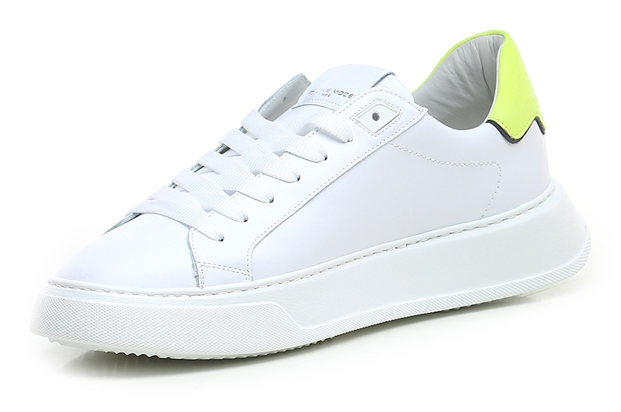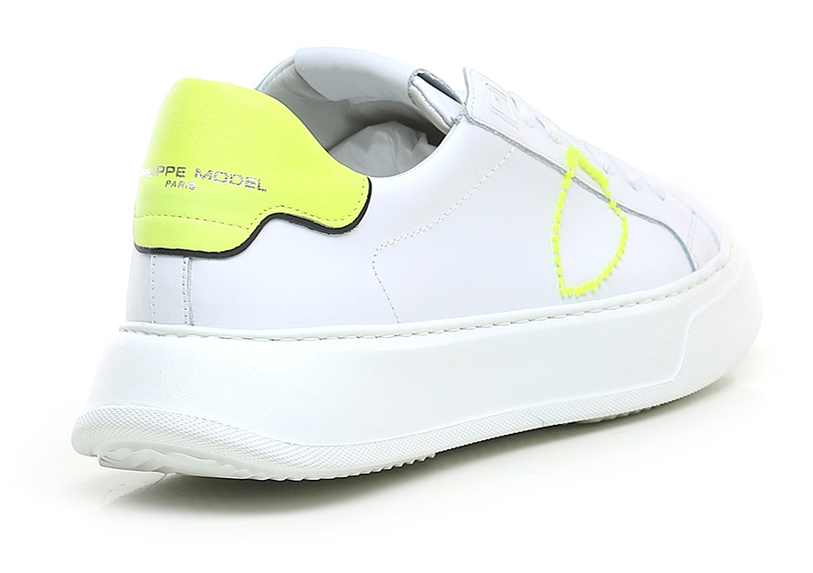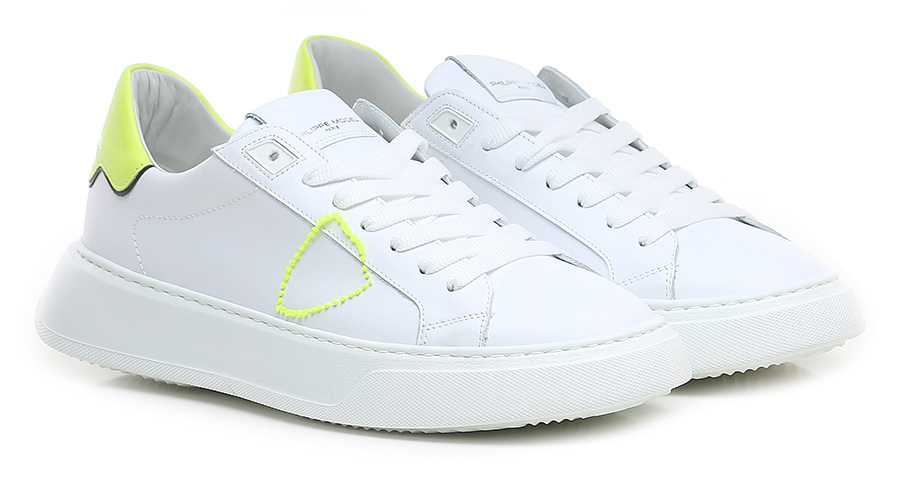 Sneaker in pelle con talloncino in pelle fluo e logo cucito, suola in gomma. Altezza tacco 40mm, platform 30mm con battuta 10mm.