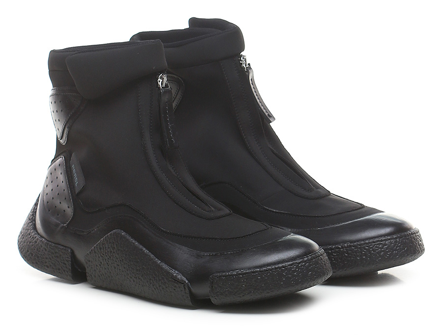 Sneaker in tessuto elasticizzato con zip frontale e chiusura con strapp. Suola in gomma. Altezza tacco 40m, platform 25mm con battuta 15mm.