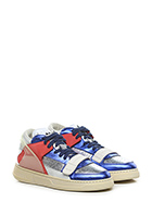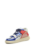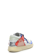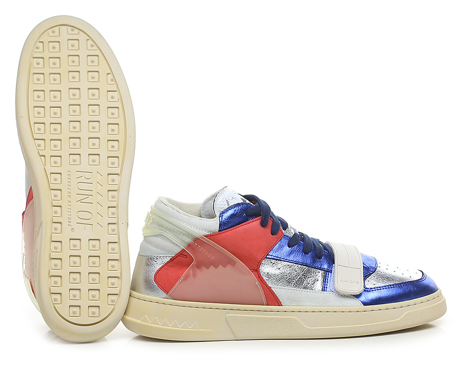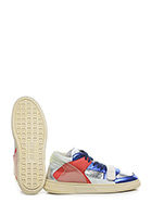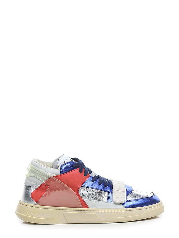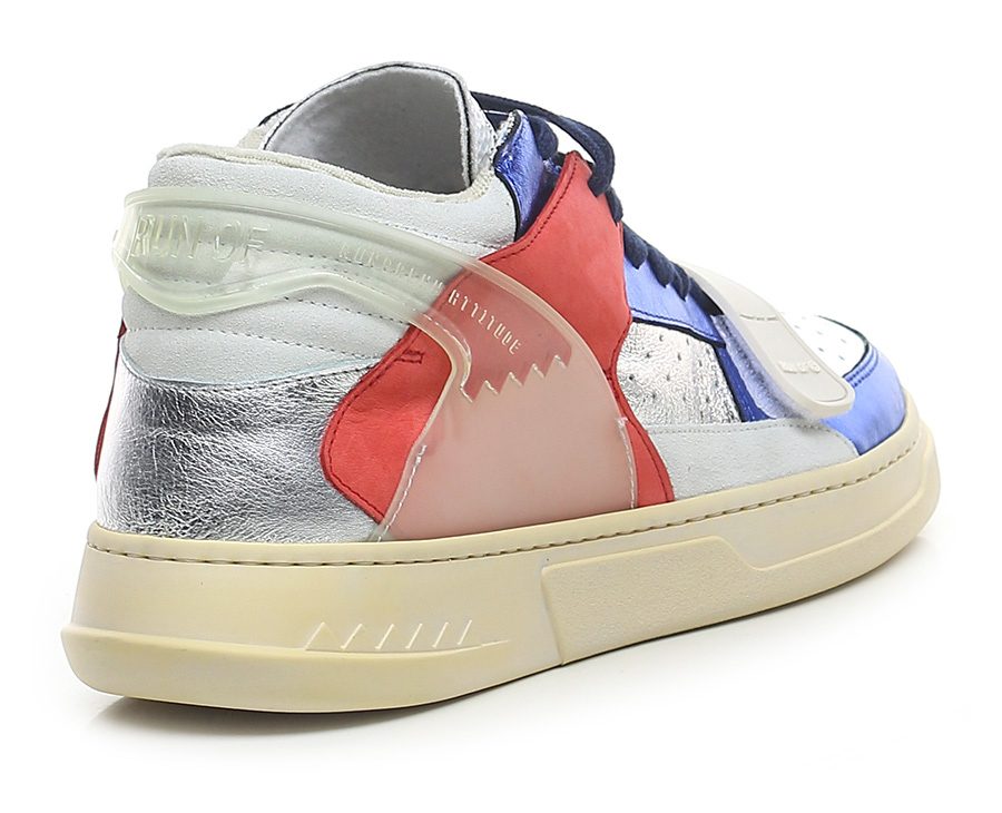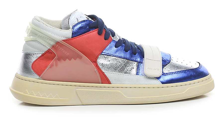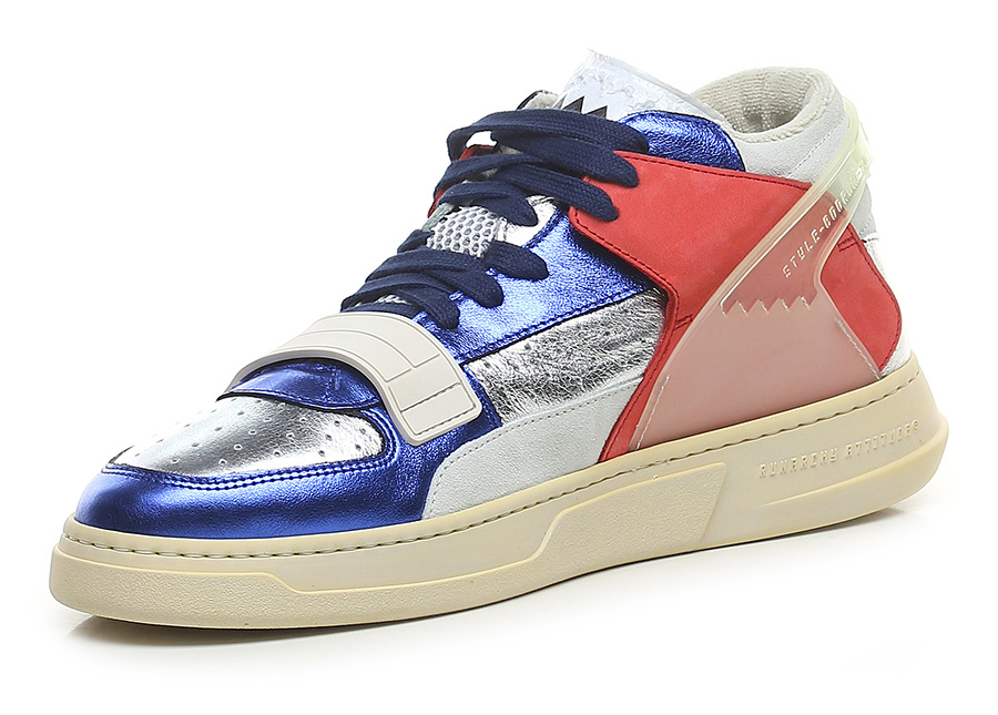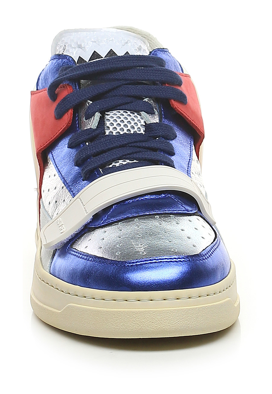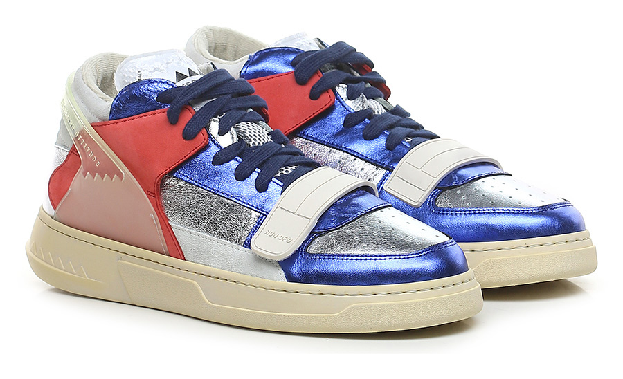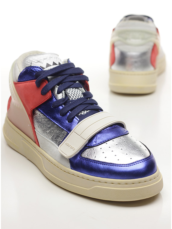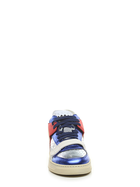 Sneaker in pelle laminata, camoscio e nabuk con inserto in pvc sul retro e strap forntale. Suola in gomma. Altezza tacco 35mm, platform 25mm con battuta 10mm.