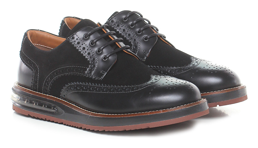 Stringata in camoscio e pelle con lavorazione stile inglese e suola in gomma. Camera d'aria interno suola, tacco 40, platform 30 con battuta 10.