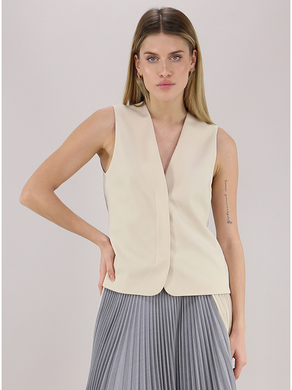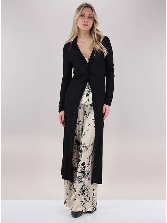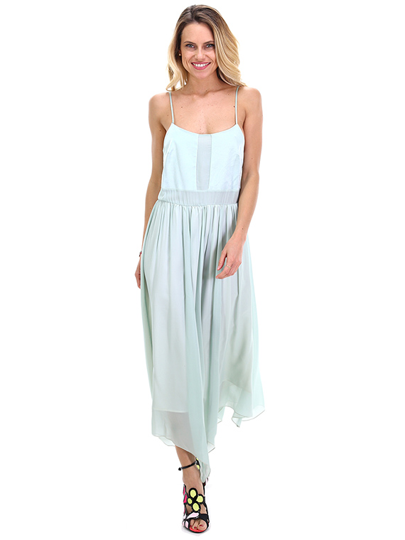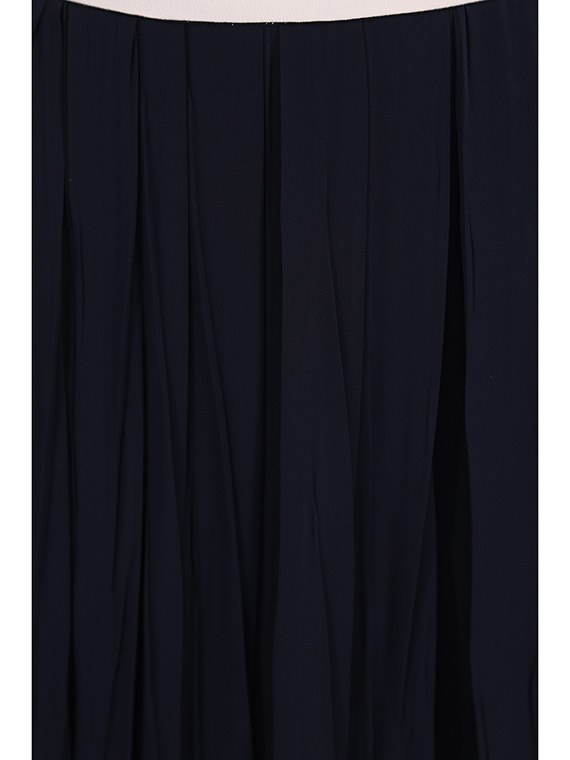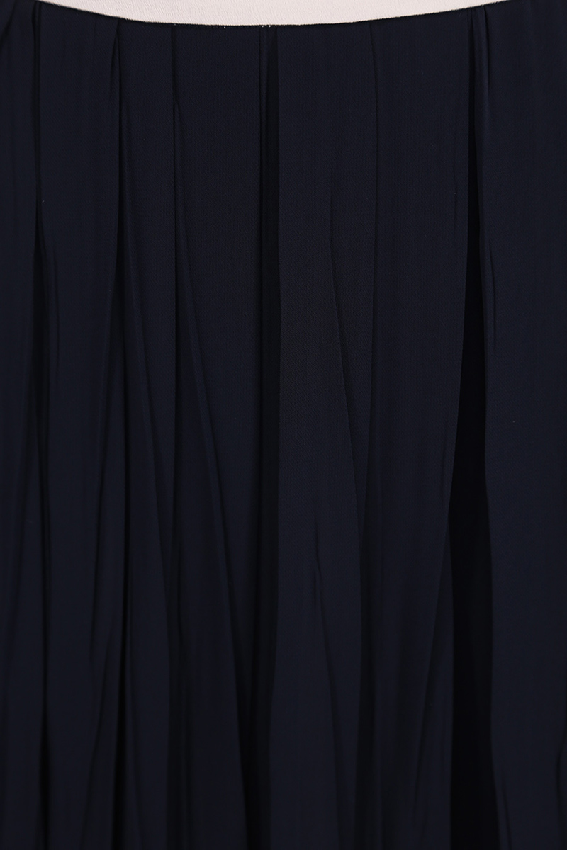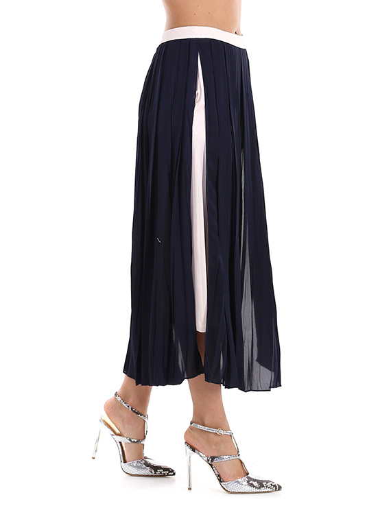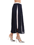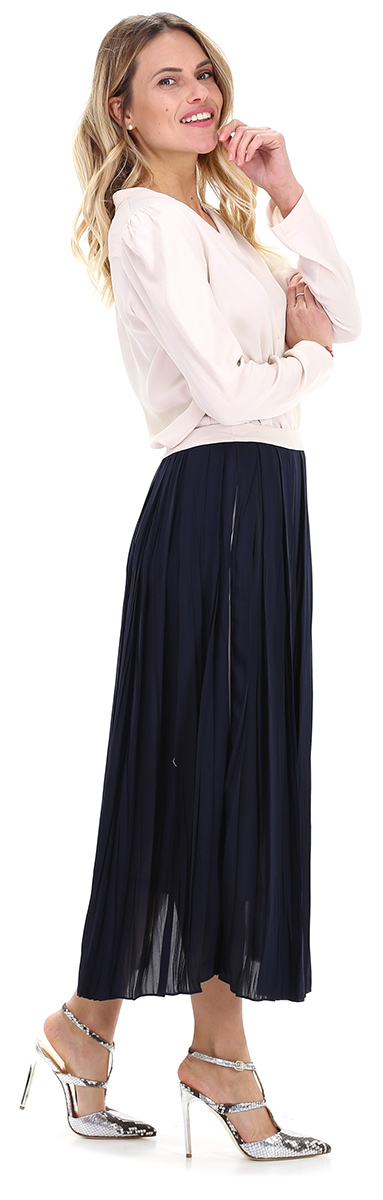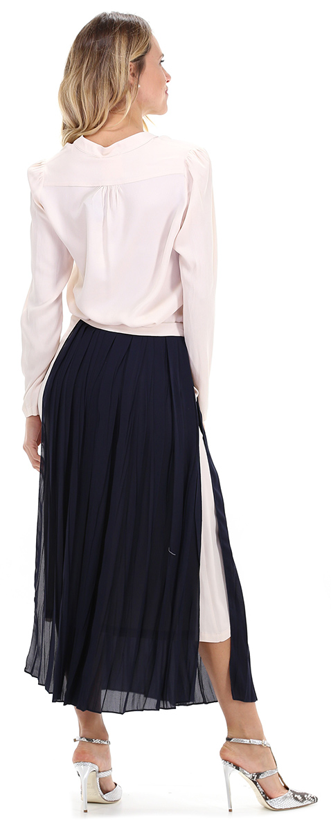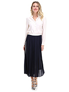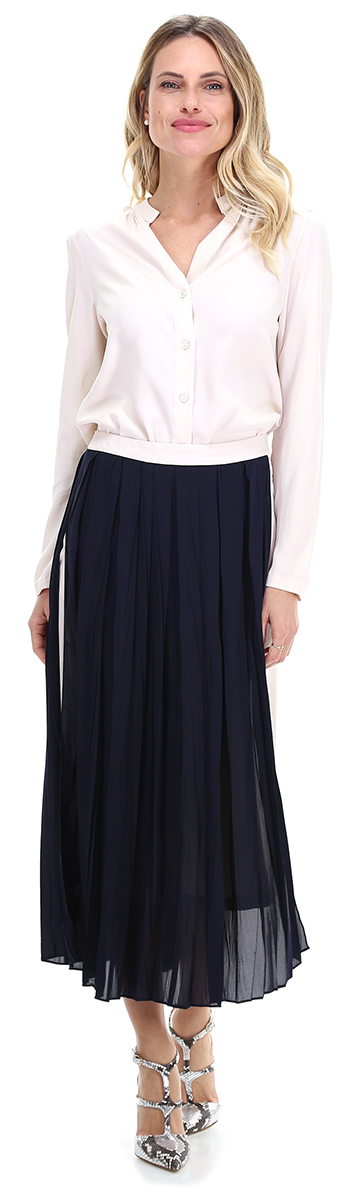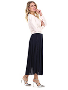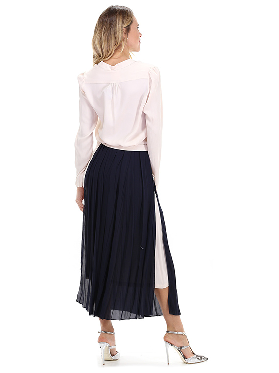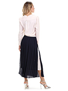 Gonna midi in misto seta con faldone fronte e retro asimmetrico in plissè. Tasche a sacchetto sui fianchi con zip di chiusura. La modella è alta 1.68 ed indossa la taglia 40.