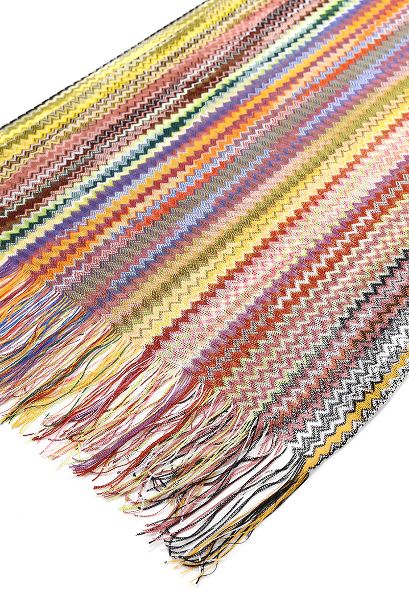 Stola in 100% viscosa. Fondo sfrangiato e fantasia multicolore.
