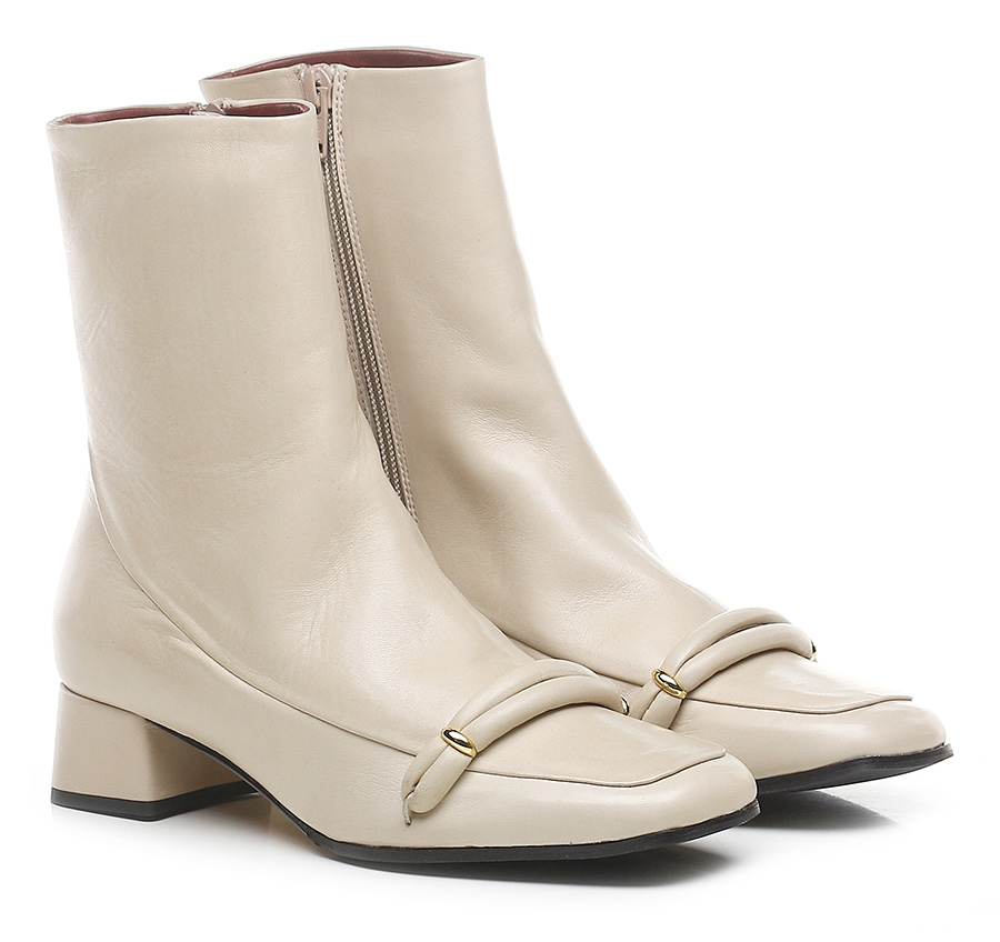 Tronchetto in pelle con zip laterale e suola in cuoio e gomma. Altezza tacco 35mm. Tacco foderato in pelle.