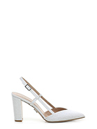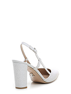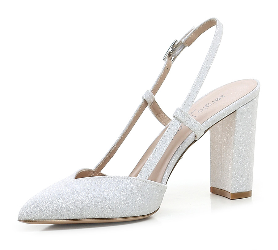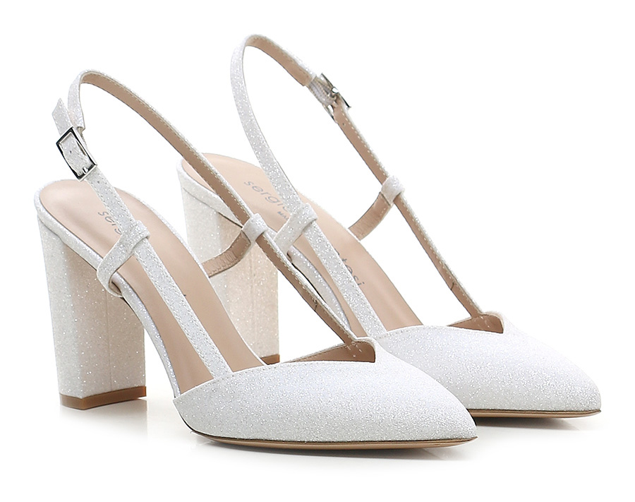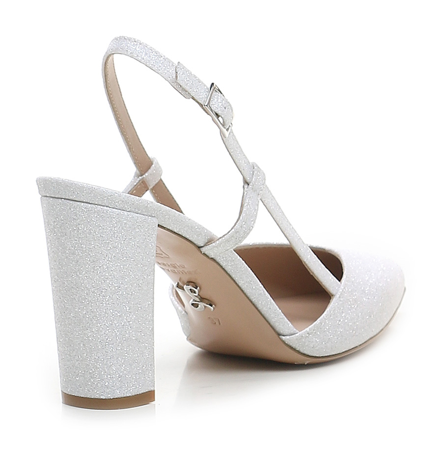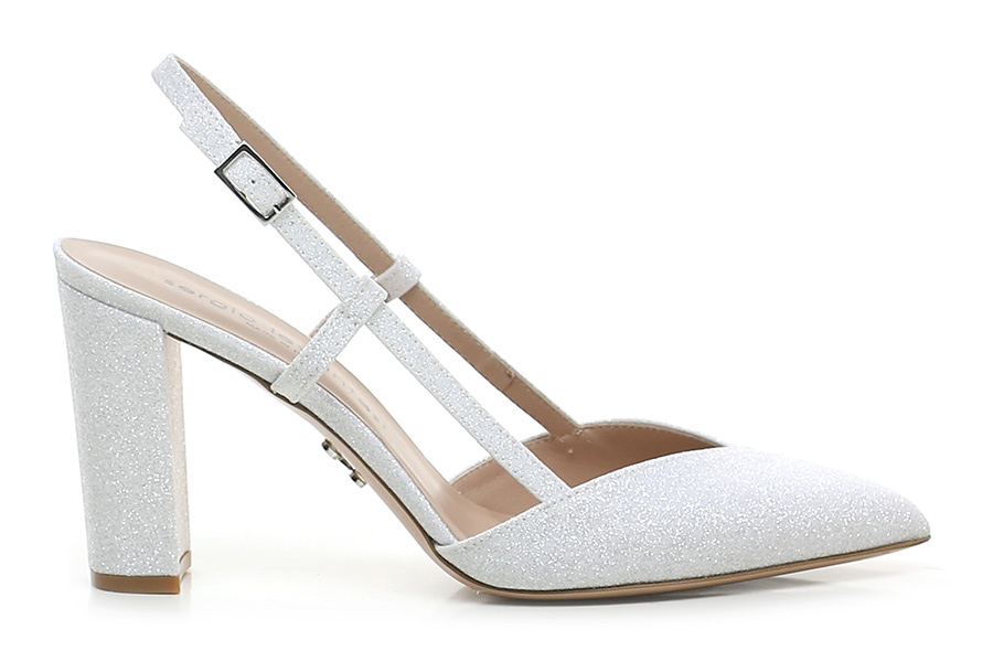 Scarpa in glittter con cinturino retro. Suola in cuoio. Altezza tacco 90mm. Tacco in pvc glitterato.