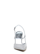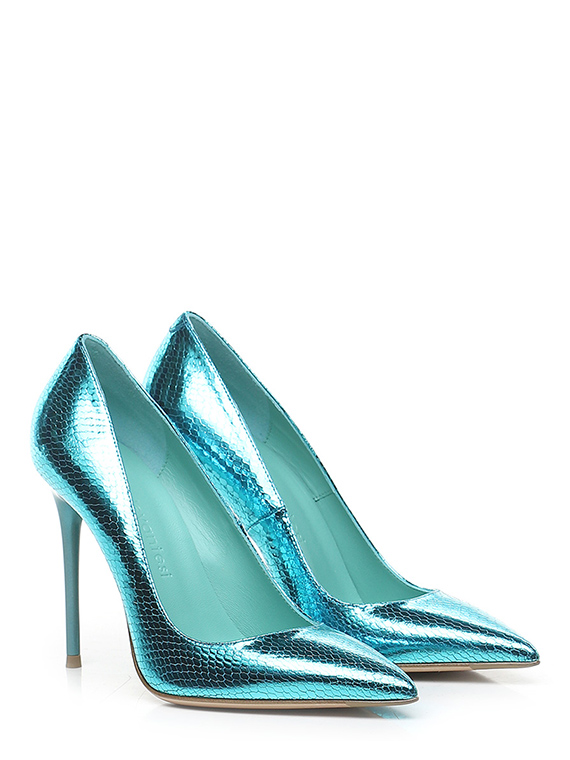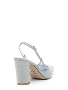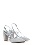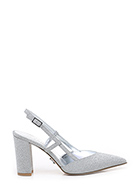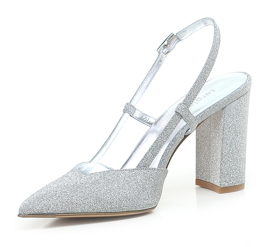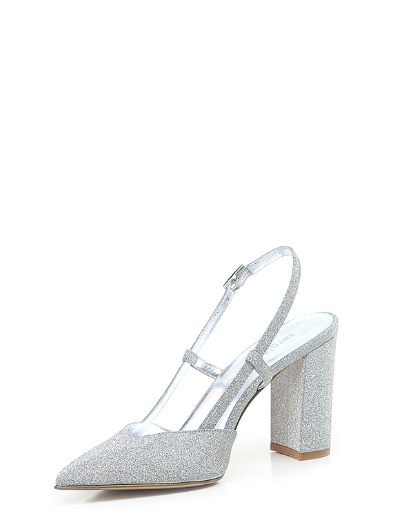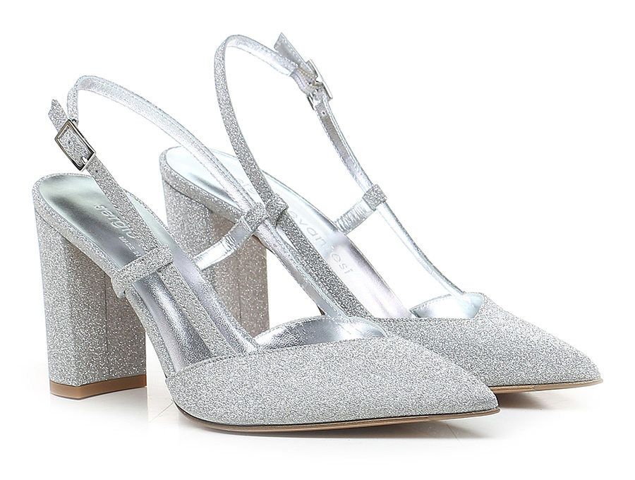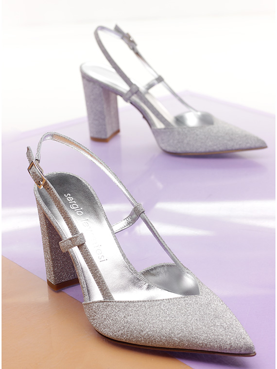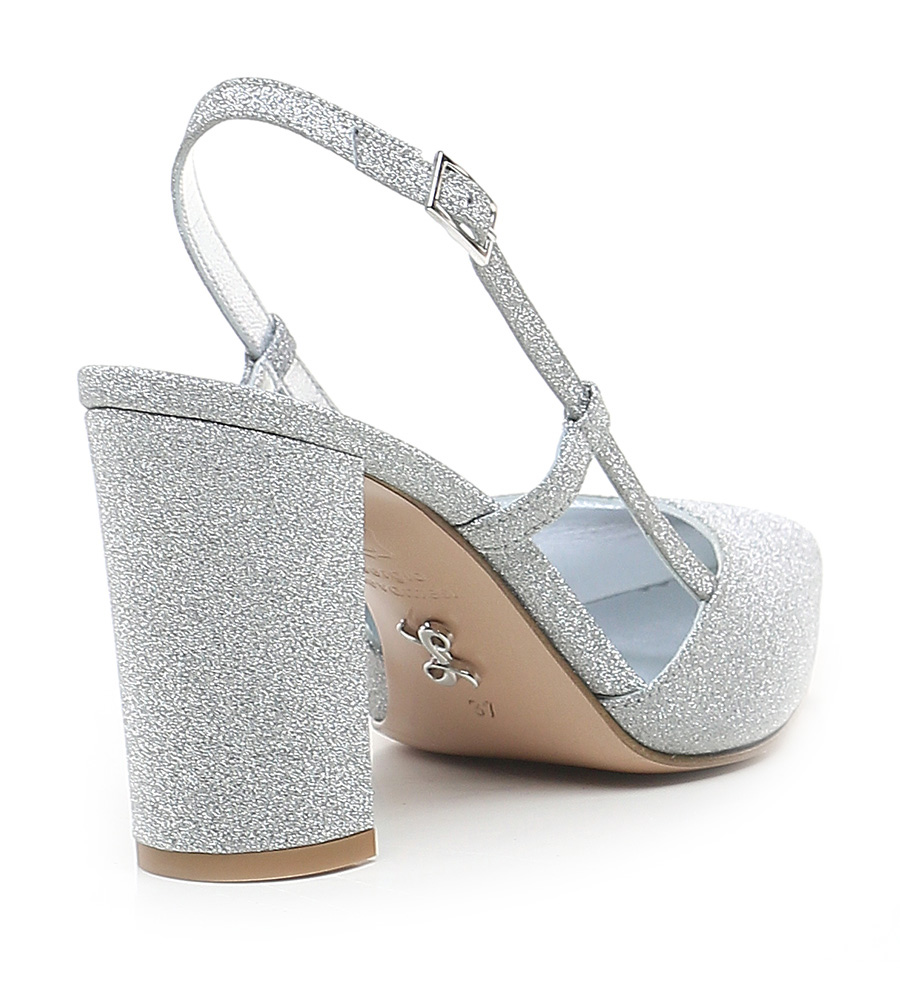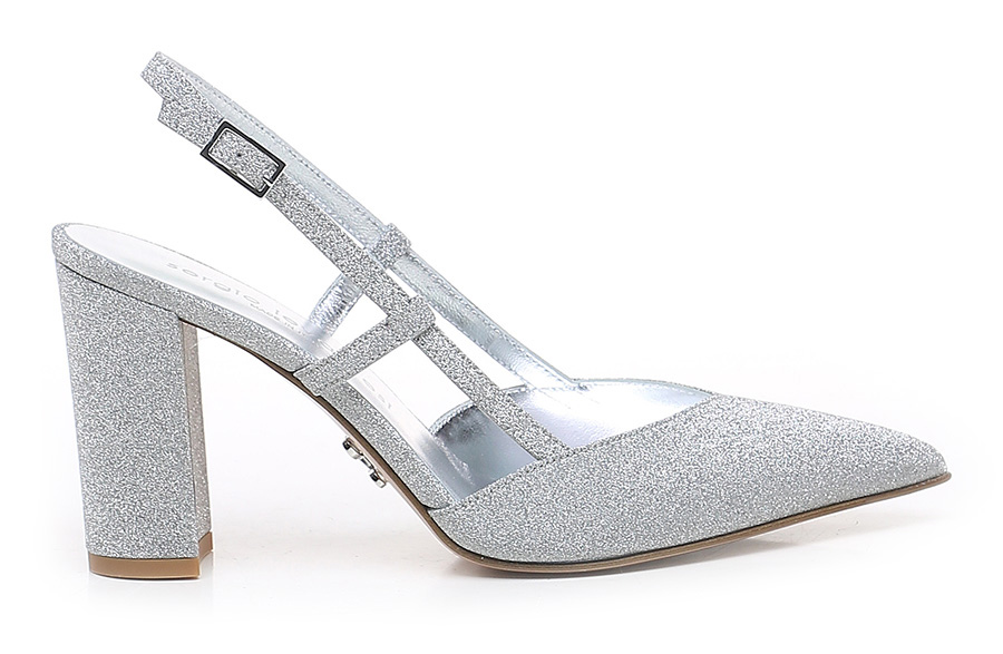 Scarpa in glitter con cinturino sul retro e suola in cuoio e gomma. Altezza tacco 95mm. Tacco foderato in glitter.
