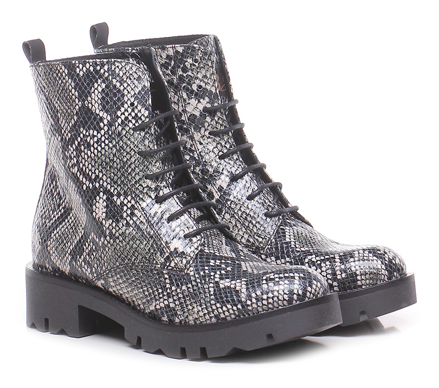 Polacco in stampa pitone con zip lato interno, suola carrarmato in gomma. Tacco 40, platform 20 con battuta 20.
