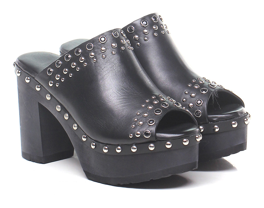Sandalo alto in pelle con applicazione borchie e strass su tomaia. Suola in gomma, tacco 105, platform 45 con battuta 60. Borchie su suola.