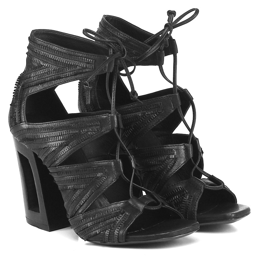 Sandalo alto in pelle e pelle lavorata con allacciatura alla caviglia frontale. Suola in cuoio, tacco 100 lavorato.