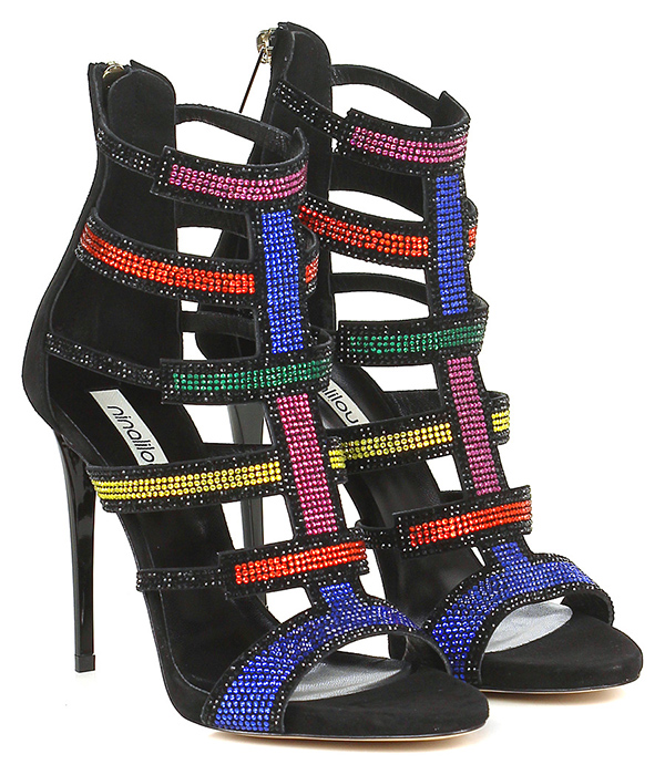 Sandalo alto in camoscio con zip su retro e strass colorati su tomaia. Suola in cuoio, tacco 110, platform 10 con battuta 100. Tacco in pvc.
