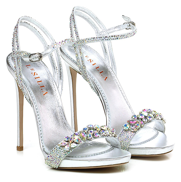 Sandalo alto in pelle laminata con cinturino alla caviglia e multi strass e pietre su tomaia. Suola in cuoio, tacco 125, platform 20 con battuta 105.