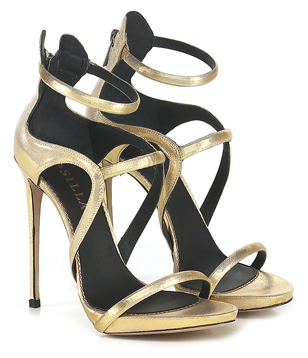 Sandalo alto in tessuto lurex e zip su retro con suola in cuoio. Tacco 120, platform 15 con battuta 105.