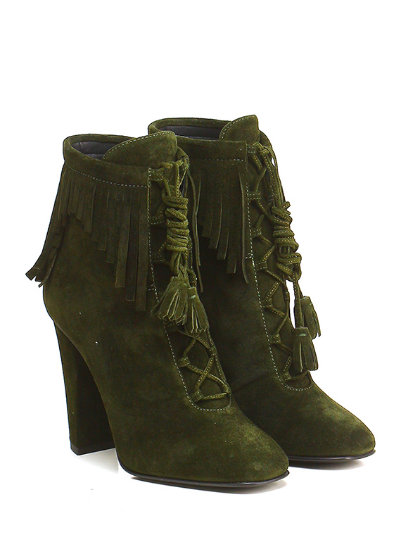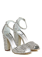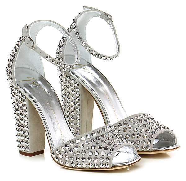 Sandalo alto in camoscio con cinturino alla caviglia con fibbia su lato esterno e cristalli applicati all-over. Suola in cuoio, tacco 110.